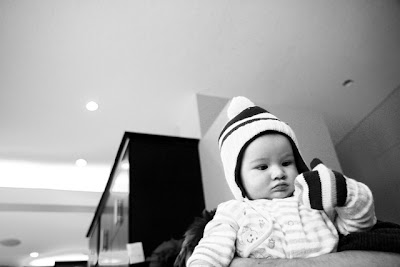 This is Rhys. We gave him mitts and a touque. He's trying to figure out where on earth his fingers went.